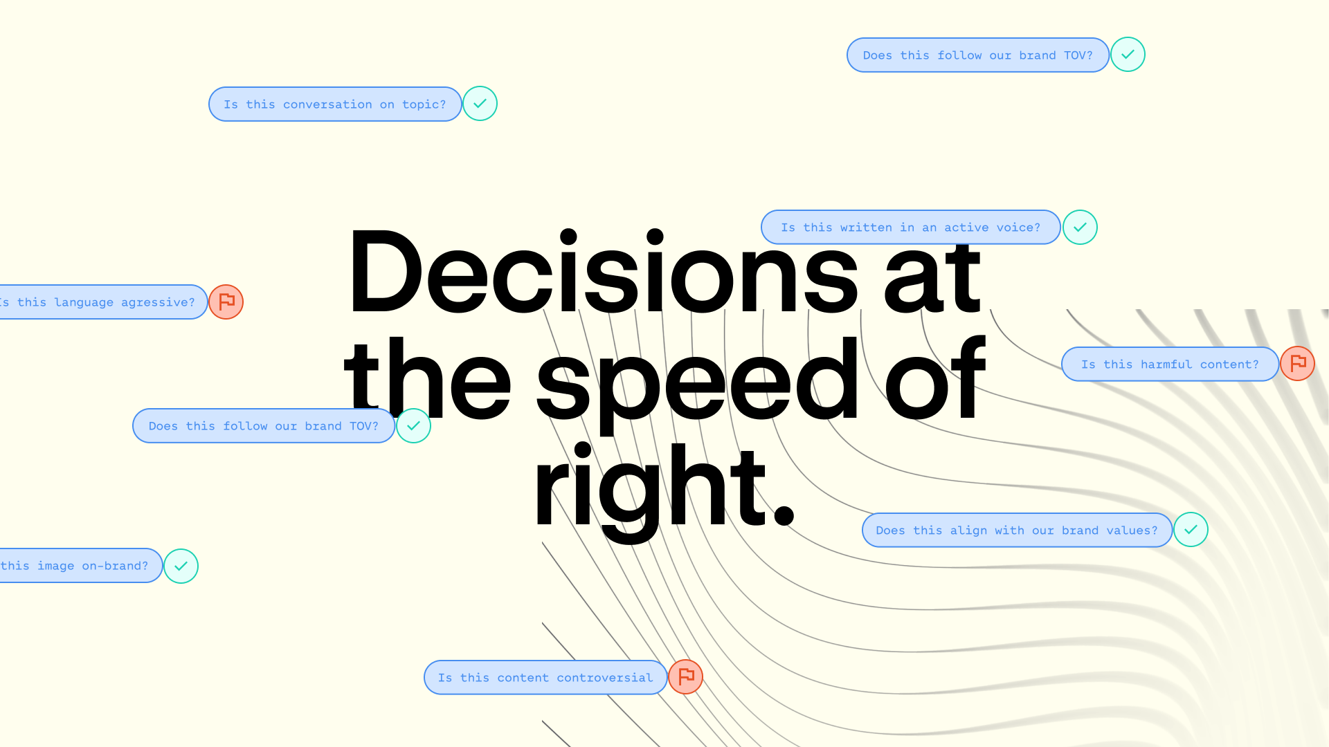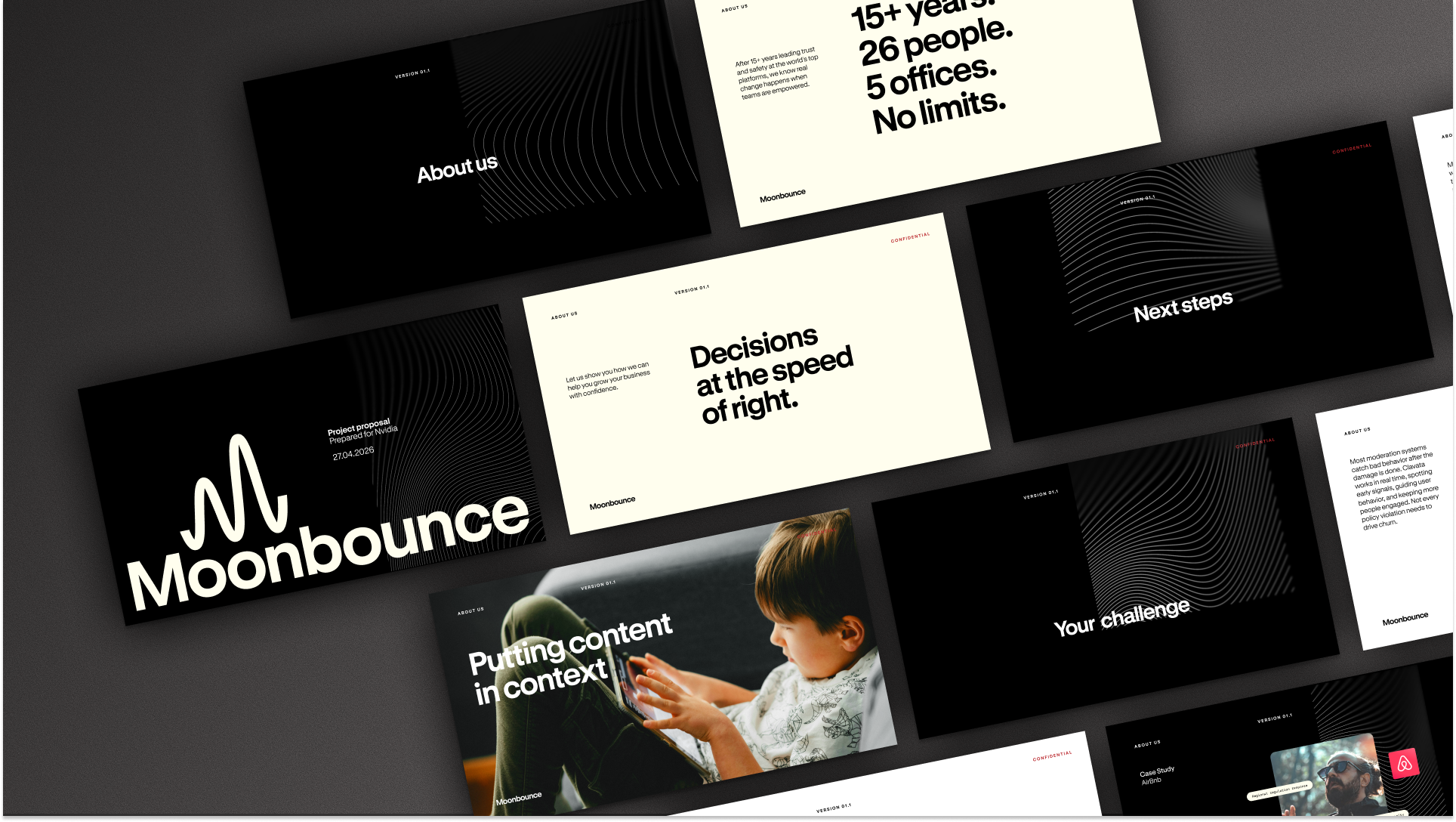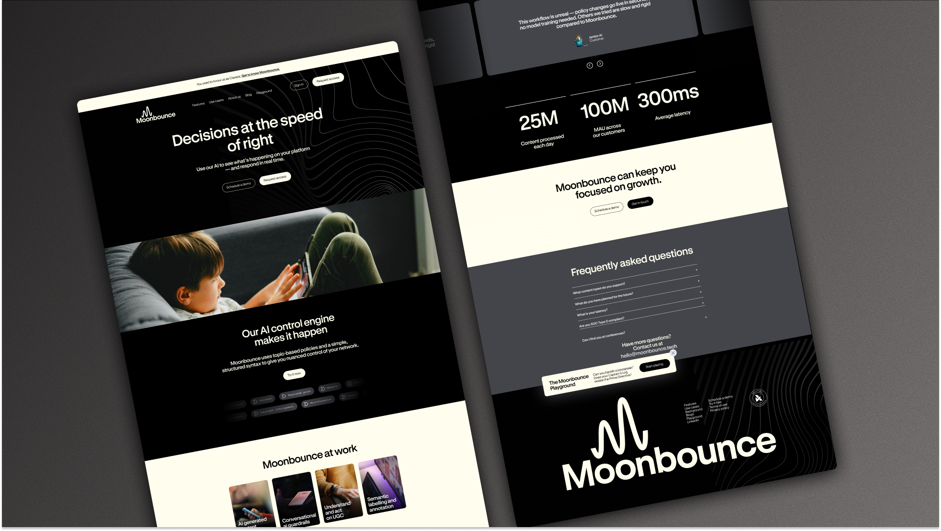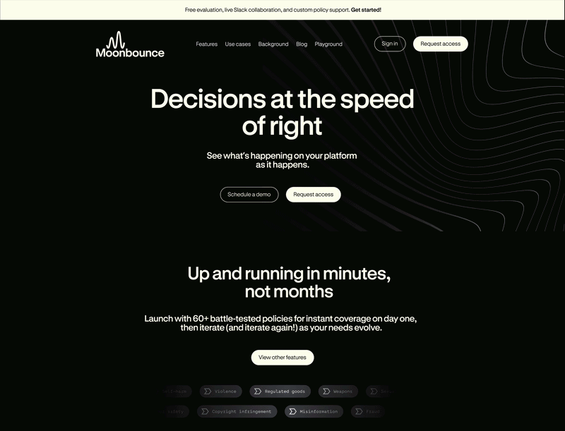 Already trusted by platforms like Match Group, Civitai and Weights, Moonbounce’s technology had proven its value. But the brand needed to signal the scale of that ambition to enterprise clients, investors and future partners. The core insight we mined was simple: by transforming long, complex natural-language policies into structured, pre-defined rules, Moonbounce lets organizations decide faster, more clearly, and with greater confidence. This became the brand's driving idea– Create with Conviction– positioning Moonbounce as the infrastructure that lets companies innovate boldly while maintaining clarity, safety and control.