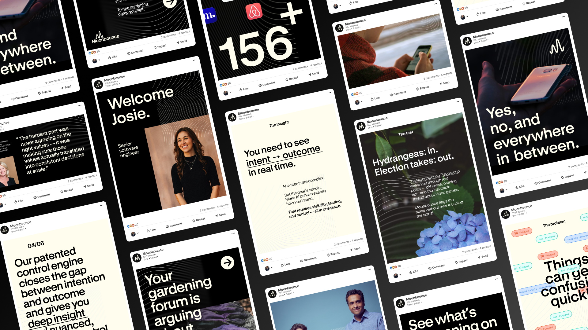 From that foundation, Ladyship led the renaming to Moonbounce, drawing on the historic Project Diana experiment, where radio signals bounced off the moon to overcome terrestrial limits– a fitting metaphor for the company's breakthrough approach to policy enforcement. In a category dominated by fear-based safety messaging and technical sameness, Moonbounce stands apart and is balanced by the brand’s new visual identity. Rooted in signal relay, the visual system combines a monochromatic palette with waveform textures that convey constant assessment, clarity and response.